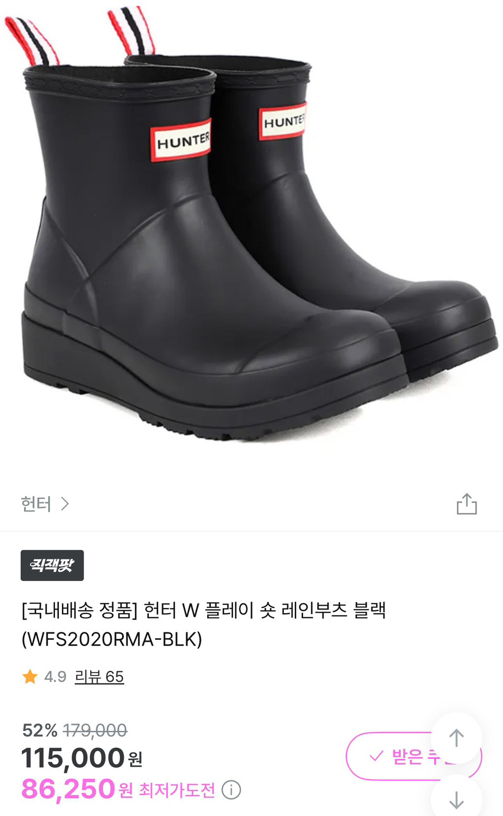 비블루 [국내배송 정품] 헌터 W 플레이 숏 레인부츠 블랙 (WFS2020RMA-BLK) 86,250