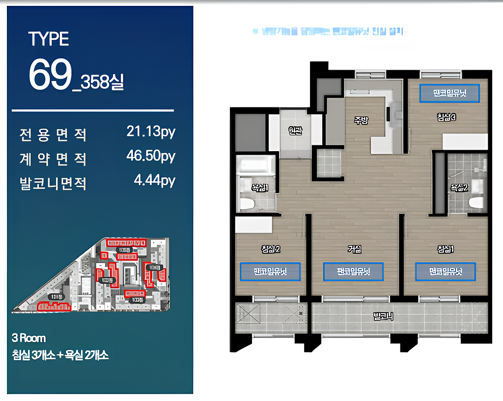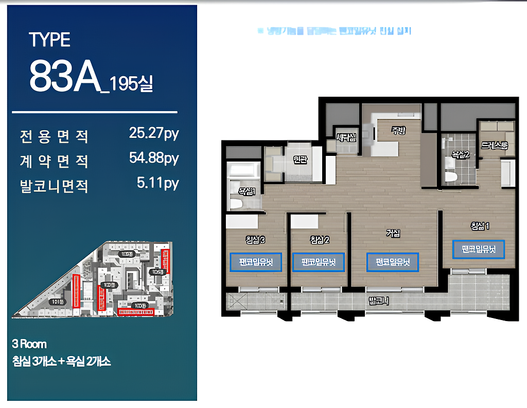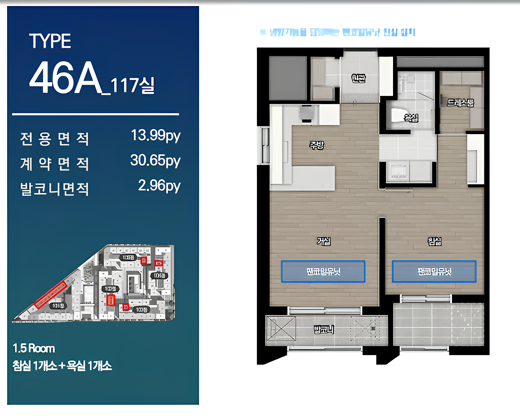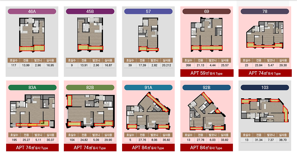 또한, 전용 69, 83A, 82B 타입 등은 아파트 59, 74 타입과 유사한 평면을 갖추었으며, 여기에 전 호실 3~8평에 달하는 서비스 발코니 면적을 추가로 제공하여 실사용 면적을 극대화했습니다. 1.5룸(46A)과 2룸(57) 타입 역시 효율적인 공간 구성으로 1~2인 가구에게 높은 인기를 끌고 있습니다.