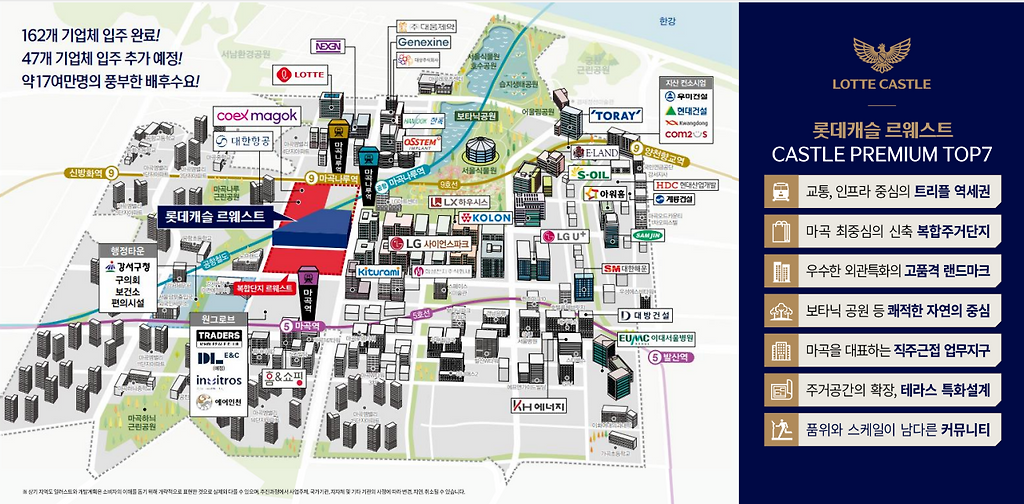 이처럼 완벽한 교통망이 필요한 이유는 마곡 롯데캐슬 르웨스트가 위치한 곳이 바로 마곡 MICE 복합단지의 심장부이기 때문입니다. 코엑스의 2배 규모에 달하는 이 거대한 MICE 밸리에는 호텔, 컨벤션 센터(코엑스 마곡), 대형 업무시설(케이스퀘어), 그리고 이마트 트레이더스를 품은 쇼핑몰(원그로브)이 모두 집약됩니다.