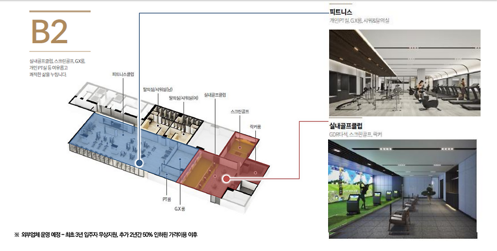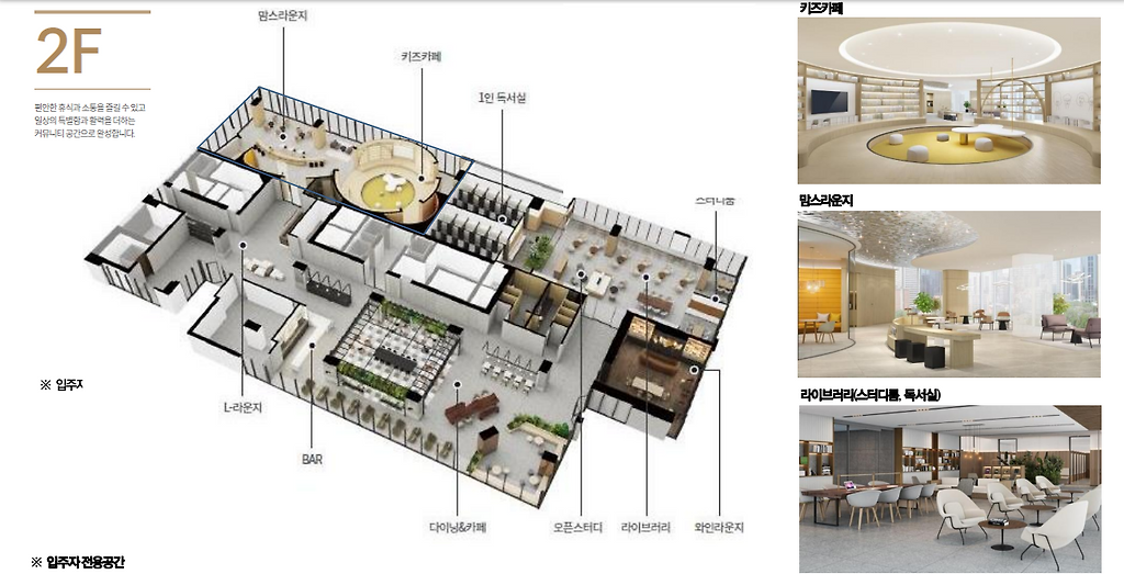 입주민 커뮤니티 시설 또한 압도적입니다. 지하 2층에는 피트니스센터, GDR 골프연습장, 스크린골프, GX룸, PT룸 등 액티브한 라이프를 위한 공간이, 지상 2층에는 L-라운지, 키즈카페, 다이닝 카페, 와인 라운지, 1인 독서실 및 라이브러리 등 사교와 휴식을 위한 공간이 마련되어 있습니다.