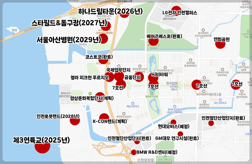 청라 피크원 푸르지 공상현장이 있는 청라국제도시는 다른 인천경제자유구역과 마찬가지로 여러 개발호재들을 가지고 있습니다. 현재까지 완료된 사업들이 있으며, 타 도시개발과 마찬가지로 주택공급이 우선적으로 진행되었던 곳이기에 앞으로는 개발호재들이 순차적으로 들어서는 것만을 지켜보면되는 단계에 있습니다.
